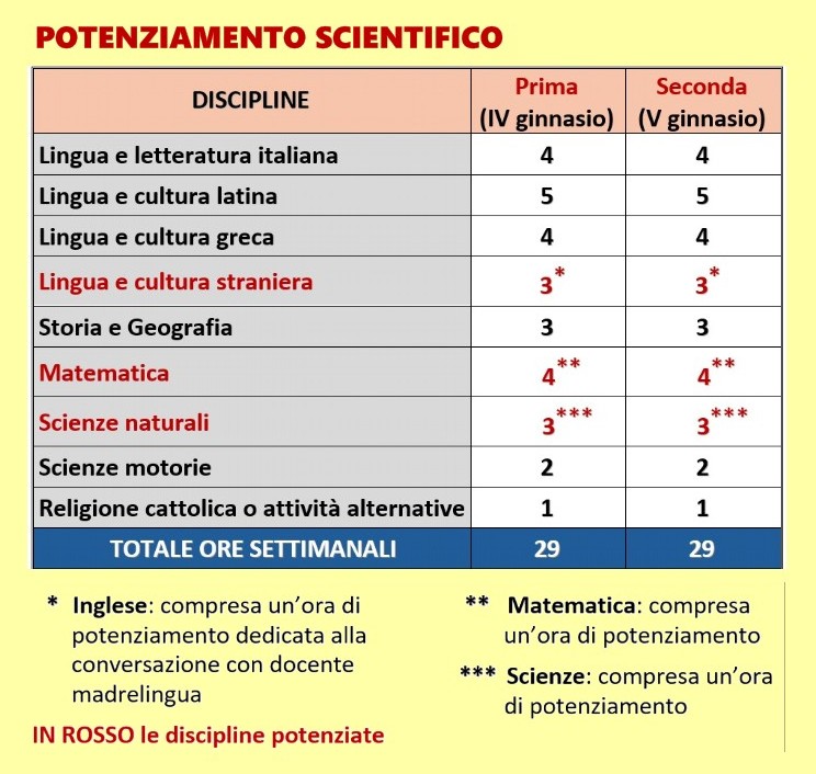 Il percorso è quello previsto dal quadro orario istituzionale ministeriale con l'aggiunta di un’ora settimanale curriculare di matematica ed un’ora settimanale curriculare di scienze.