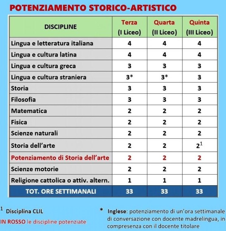 Curricolo con potenziamento di storia dell’arte (33 ore settimanali): si aggiungono al quadro orario istituzionale ministeriale due ore settimanali curriculari di potenziamento di storia dell’arte.